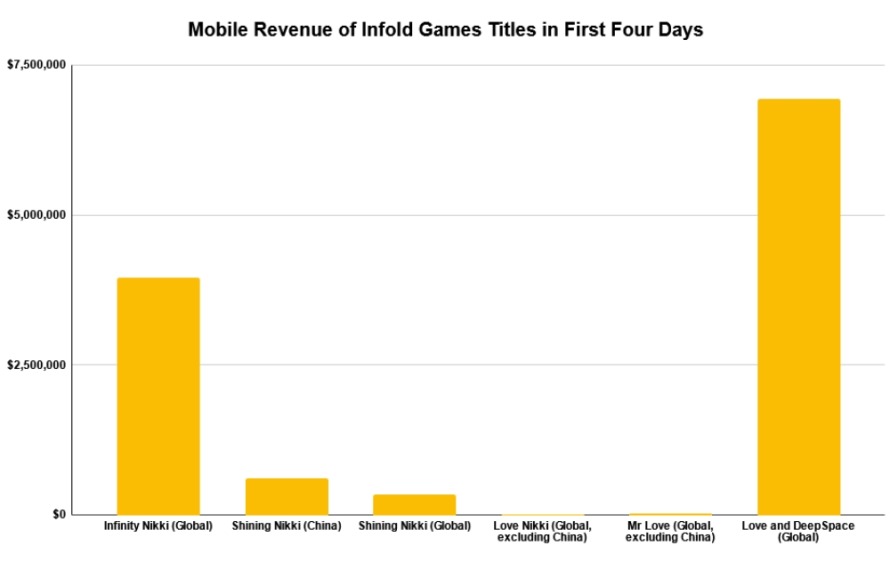Many earlier Infold titles saw staggered releases across different regions. Love Nikki, for example, made just over $5,000 in its first four days internationally in 2017, excluding China.