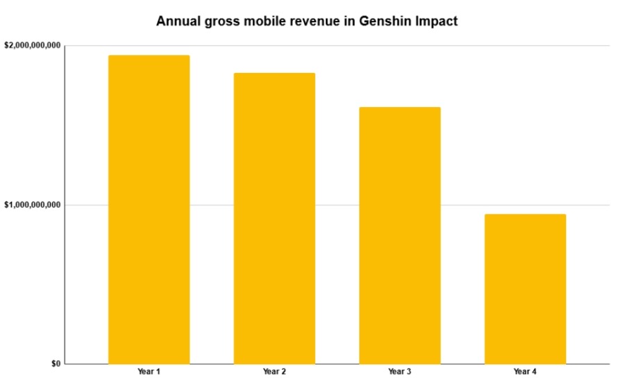 With $6.3 billion in lifetime mobile revenue, AppMagic data indicates Genshin Impact’s annual earnings slowly declined year-on-year up to its third anniversary, but have since fallen more rapidly. The game made $1.9 billion on mobile in its first year, $1.8 billion in its second and $1.6 billion during year three.