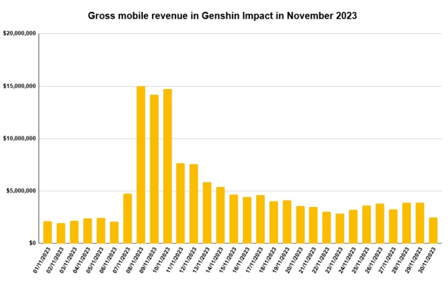 Genshin Impact’s most successful update in the past year was Version 4.2 on November 8th, 2023, which racked up $15 million on update day, $14.2 million the day after and a further $14.7 million during day three.