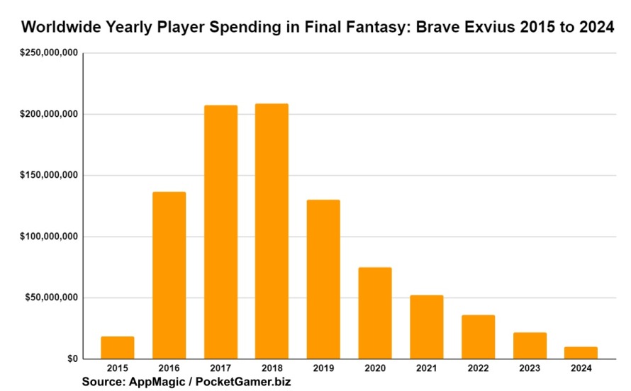 According to AppMagic estimates, Brave Exvius had generated $896.3 million ($627.4m) worldwide from lifetime player spending and 19m downloads across the App Store and Google Play.