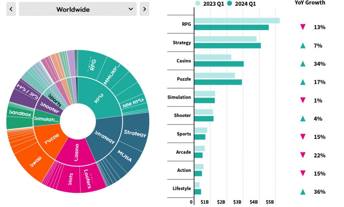 RPGs are declining in revenue but are still the most lucrative genre with $4.6 billion in Q1 2024, but falling from $5.3 billion in the Q1 last year.